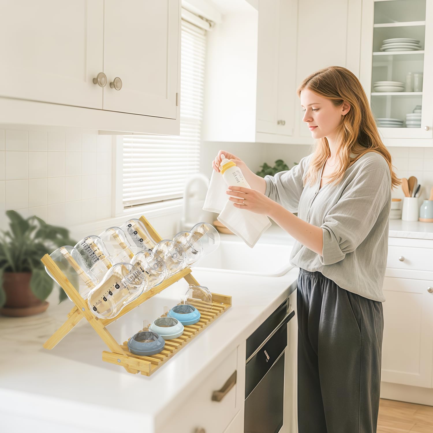 The functional design provides a Smart Swap for kitchen organization, allowing the large-capacity rack to be stored flat in a drawer to maintain a clutter-free nursery environment.