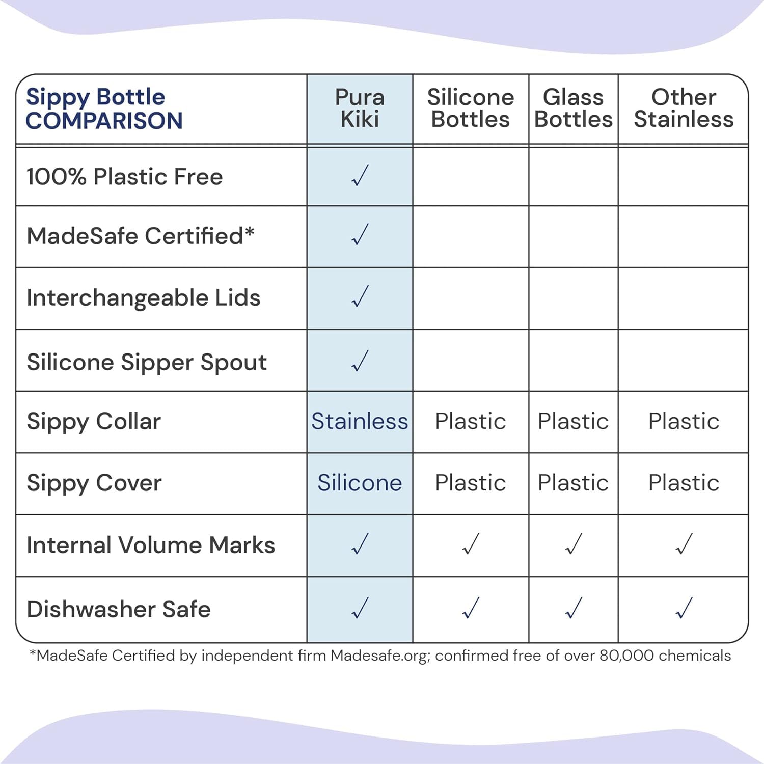 The Pura Kiki system provides TRUE plastic-free evolution by utilizing high-purity materials that remain stable under any condition. As the only bottle line to be MadeSafe Certified, it uses 304-grade stainless steel and medical-grade silicone exclusively throughout its construction. By eliminating plastic threads and petroleum-based liners, it provides a clean, chemical-free environment for your child's nutrition. It is a Smart Swap that ensures water or milk remains completely protected from "chemicals that mess with your body's natural rhythm," providing total peace of mind for every sip.