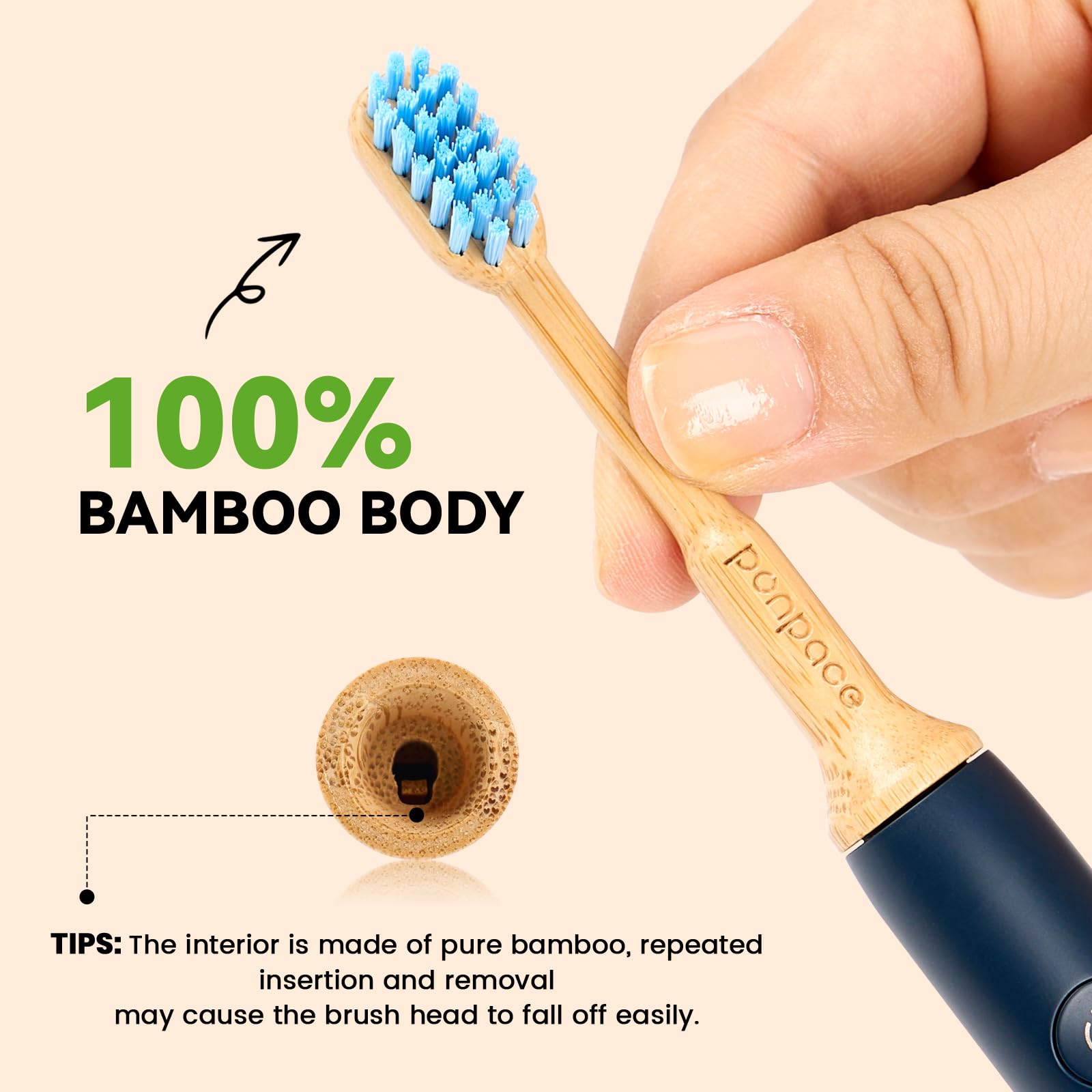 | Choosing the Ponpace Bamboo Head ensures a 94% plastic reduction by eliminating the bulky plastic body and minimizing reliance on petroleum-based materials, thereby providing a cleaner, non-toxic contact surface for your daily oral care routine. |
